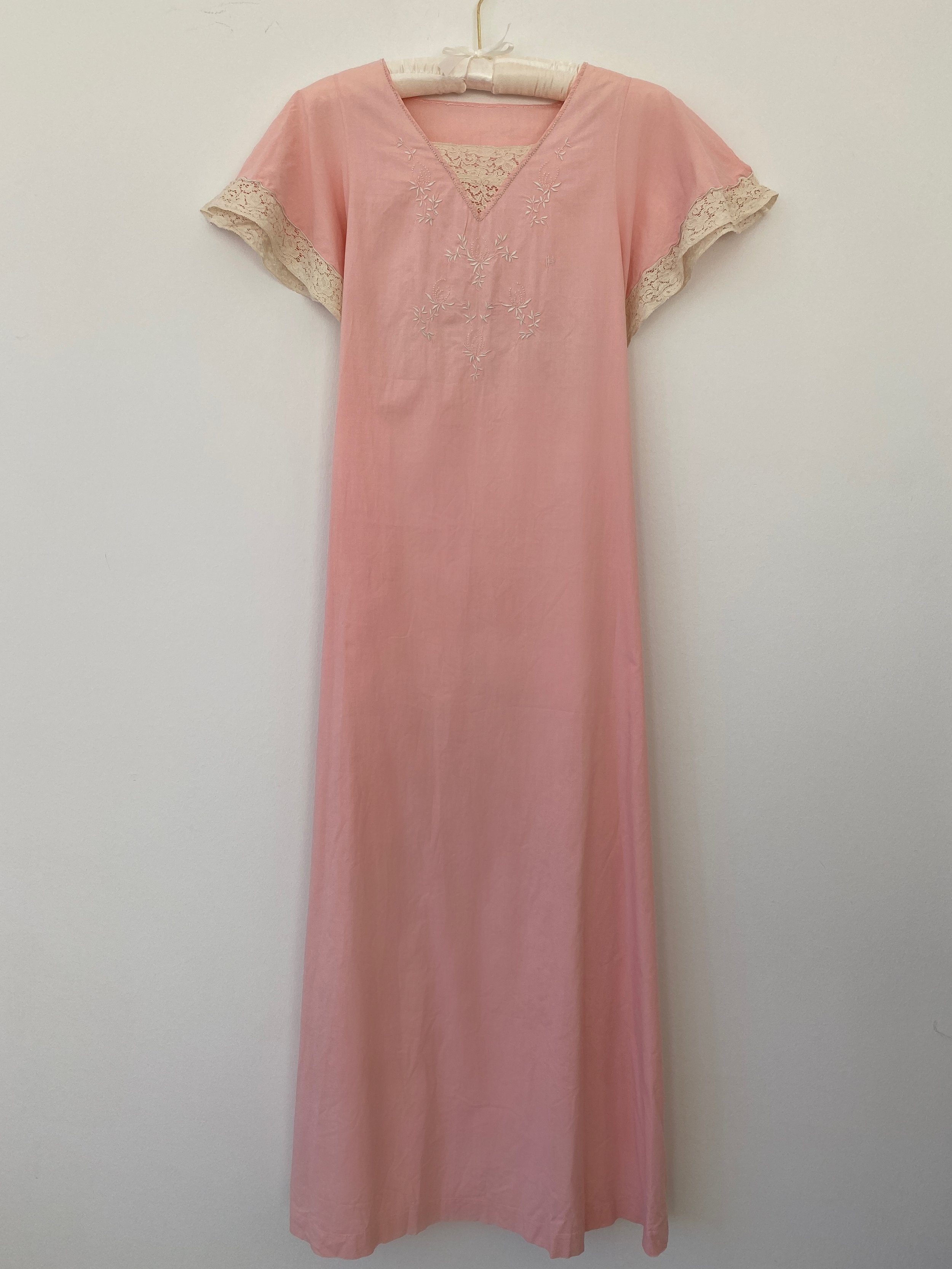1930's pink silk dress with peter pan collar. The softest silk you have ever felt. Beautiful lace detailing at collar, bust, and hem of straps. The cutest matching lace pocket at front of skirt. Matching ribbon at waist. Scalloped hem at bottom of skirt. Dress has no openings or closures.