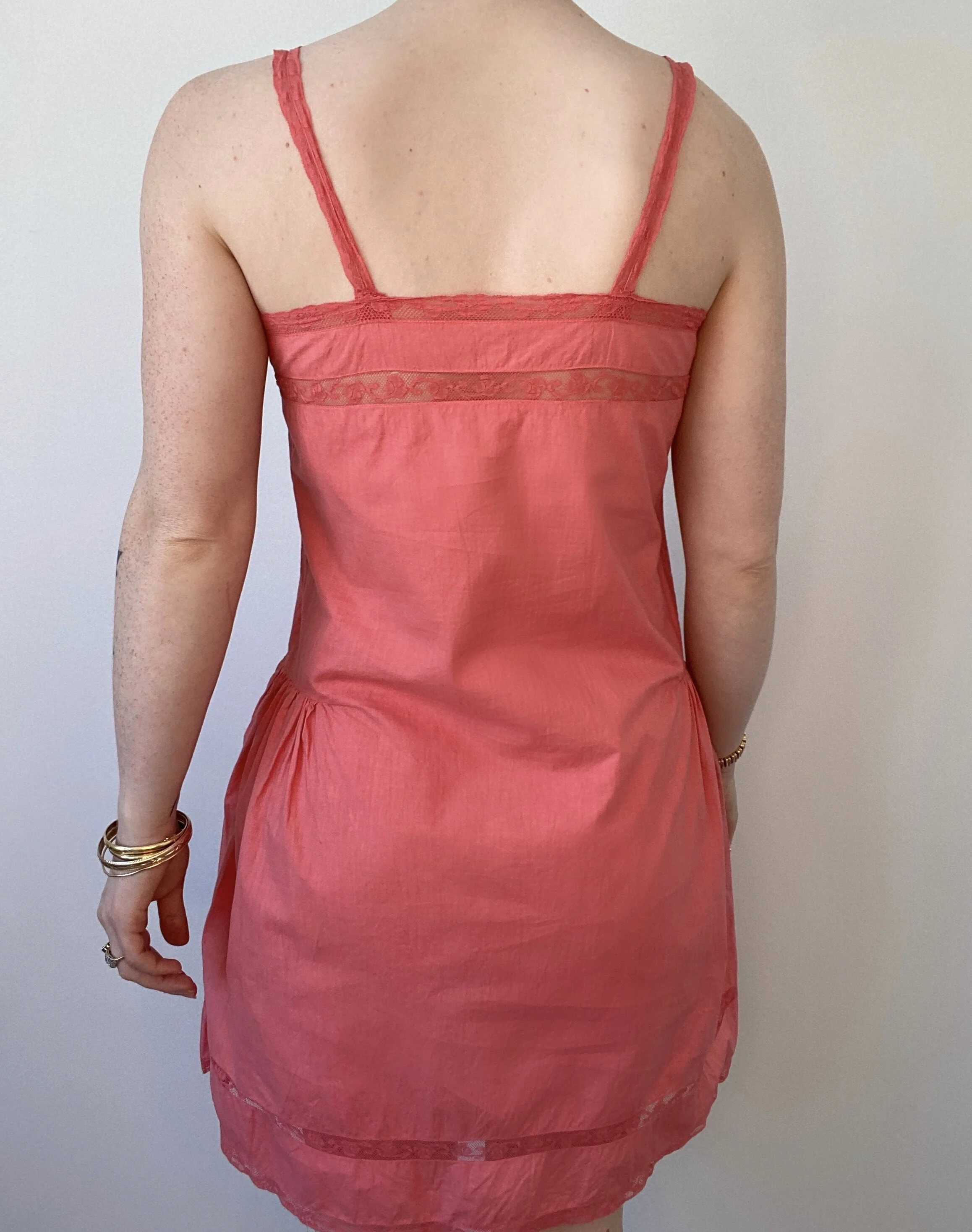 Hand dyed coral edwardian cotton shift dress with lace detailing at bust and hem. Lace ribbon straps. Midi length.